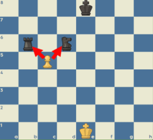 Bu bir çifte saldırıdır. İlk refleks, bu saldırıyı doğrudan savuşturmak, yani saldıran piyonu ortadan kaldırmaktır. Ancak eğer o piyon korunuyorsa onu almak, ondan çok daha kıymetli olan taşınızı kaybetmenize yol açar. Ya da görselde olduğu gibi piyon korunmamasına ragmen bazen de saldırı altındaki taşlarınız, piyonu alabilecek hareket kabiliyetine sahip olmayabilirler. Bu noktada oyuncular genelde daha değerli olan kaleyi kurtarıp, atı feda etmeye razı olur. Ama bu hâlâ bir kayıptır.